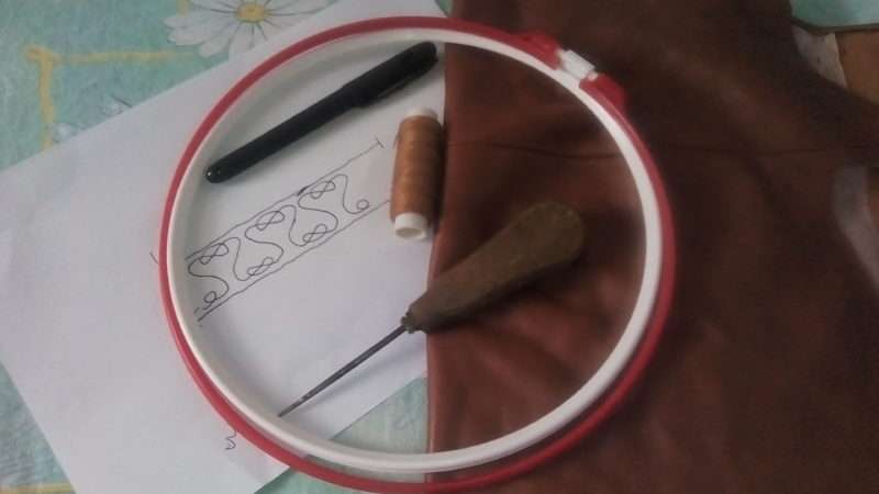 Вначале понадобится эскиз для вышивки, шило, толстые швейные нитки для джинса, игла и кожаная ткань, опционально деревянная поверхность. На деревянной доске удобнее всего работать с шилом.